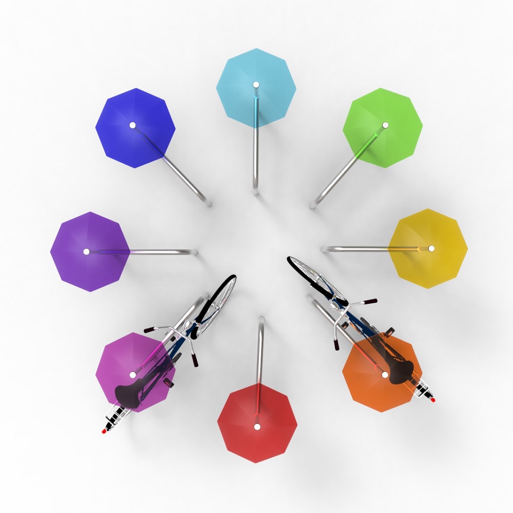 Själva övertäckningen, eller paraplyet om man så vill, kan levereras i transparent färg eller i blått. Dessutom kan vi, beroende på kvantitet, även leverera i alla andra RAL-färger. Vi kan också leverera semitransparenta färger. Bikebrella är en världsnyhet utvecklad i Tønsberg i Norge. Några av fördelarna med produkten är att övertäckningen kan placeras på små ytor, går snabbt att montera och kräver minimalt med grundarbete. Övertäckningen tar också liten plats visuellt i stadsrummet, skapar inga barriärer (man kan gå mellan ställen) och kan designas antingen för att smälta in i omgivningen, eller för att stå ut och synas.