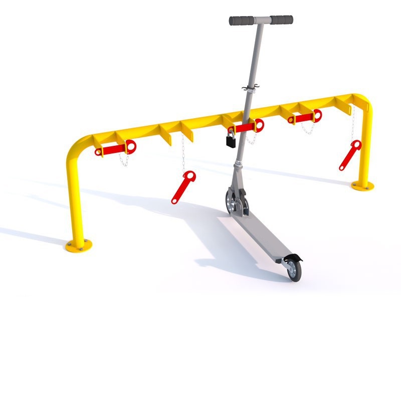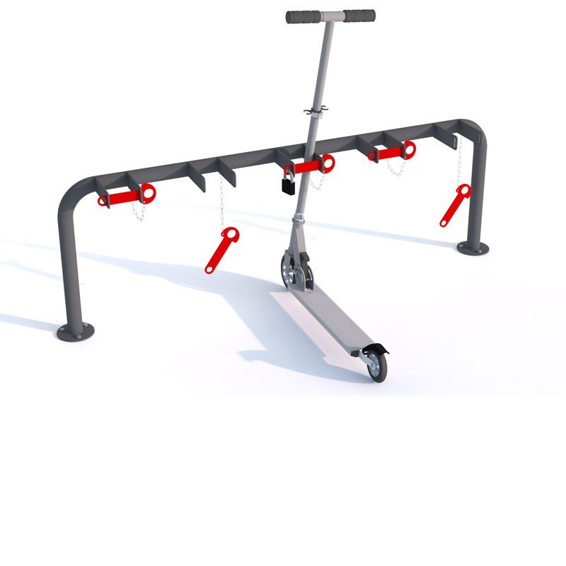 SPA7 är ett ensidigt fristående sparkcykelställ med 5 platser för nedgjutning eller ytmontering. Stället kan fås antingen galvaniserat, galvaniserat och pulverlackerat i valfri RAL-färg eller i rostfritt stål. SPA7 levereras med låssprintar som håller sparkcyklarna på plats och som kan låsas med användarnas egna lås.
